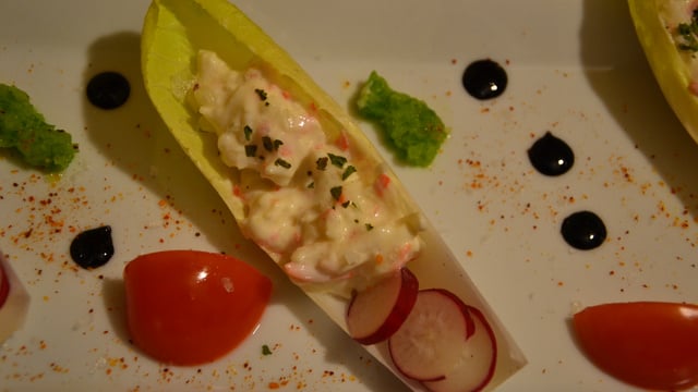 Se servir des feuilles d'endives comme une coque. Décorer avec des lamelles de radis finement râpées et les tomates cerises.
