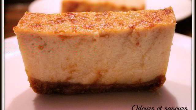 Verser le tout sur la base speculoos, puis mettre le moule dans un récipient plus grand rempli à moitié d'eau pour faire un bain-marie et mettre au four environ 30-40 min. Pour tester la cuisson, il suffit de planter un couteau et de vérifier qu'il ressorte quasi propre.