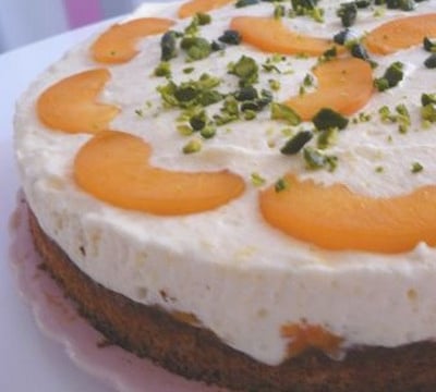 Sur la base de dacquoise, étaler les abricots cuits puis la mousse et faire prendre au congelo 1 heure minimum. Couper l'abricot restant en fines lamelles et décorer le gâteau, j'ai également ajouter des pistaches concassées. Avant de servir, retirer le cercle délicatement soit à l'aide d'un sèche cheveu ou d'un chalumeau.