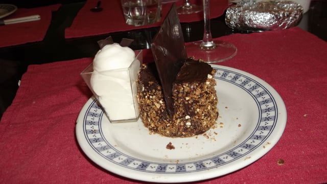 Le lendemain retirer les cercles. Refaire une ganache et en couvrir chaque gâteau entièrement. Parsemer de pralins et mettre au frigo 1h. Sortir et couper au milieu de chaque gâteau pour insérer le carré de chocolat. Servir avec une coupelle de chantilly au mascarpone.