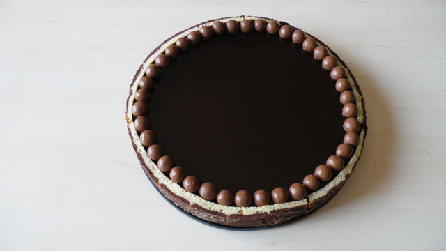Mélanger avec une spatule, laissé reposer et utiliser à une température d'environ 35 °C (th.1). Couler rapidement sur le gâteau pour éviter des grumeaux avec le changement de température.