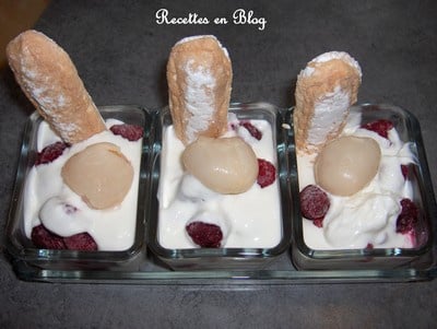 Dans chaque verrine, déposer un biscuit, ajouter une cuillère à café d'eau de rose, quelques framboises, des lychees.
