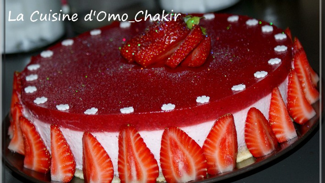 Rajouter les 200g de coulis de fraises restant et bien froid. Verser ce coulis sur le bavarois et remettre au frais une nuit avant de démouler (au moins 4h). Démouler délicatement et décorer avec une grosse fraise en rosace et des quartiers de fraises tout autour et parsemer avec quelques paillettes. Déguster bien frais.