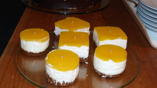 Déposez les feuilles de gélatine restantes dans un bol et faites les ramollir. Prenez les mangues au sirop, égouttez-les et mixez-les. Chauffez-en 100 g dans une casserole et faites-y fondre la gélatine égouttée. Ajoutez-y les 100 g de purée restant ainsi que le sucre glace et mélangez bien puis laissez refroidir un peu. Avant que la gélatine ne prenne, versez le coulis sur la mousse dans les emportes pièces puis lissez bien le dessus. Mettez vos entremets au réfrigérateur au minimum 4 heures, mais l'idéal étant toute une nuit.