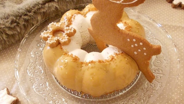Décor (jour-même) : Briser les crêpes dentelles. En déposer tout autour de la base de l'entremet. Egalement, en mettre sur la séparation flocage/glaçage. Étaler la pâte à biscuit pain d'épices, découper les formes souhaitées. Suivre les instructions suivantes pour la cuisson : ici. Glacer les pièces avec du glaçage royal. Décorer l'entremet avec les biscuits. Décorer l'entremet de paillettes d'or. Laisser décongeler l'entremet 4h au frigo.