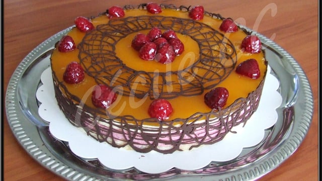 Contour de l'entremets : découper une bande de feuille de rhodoïd de 4 cm de haut et de longueur du contour du cercle. le fixer sur le plan de travail et dessiner des motifs au cornet. Laisser le chocolat figé un peu et placer la feuille autour du gâteau, mettre au frigo le temps que le chocolat durcisse puis retirer délicatement la feuille de rhodoïd.
