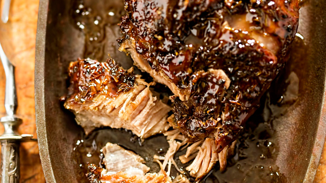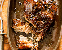 Epaule d'agneau confite, accompagnée d'une ribambelle d'échalotes, et d'un jus d'ail