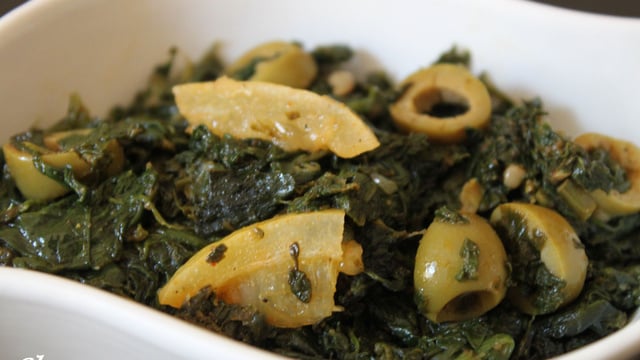 - 3Faire revenir.Ajouter les olives mauves cassées ou les olives vertes coupées et 1/4 citron confit coupé en petits dés.