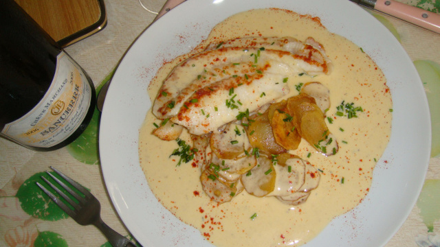 Disposez les escalopes de poulet et les pommes de terre dans une assiette de service, nappez de crème et servez aussitôt, chaud.