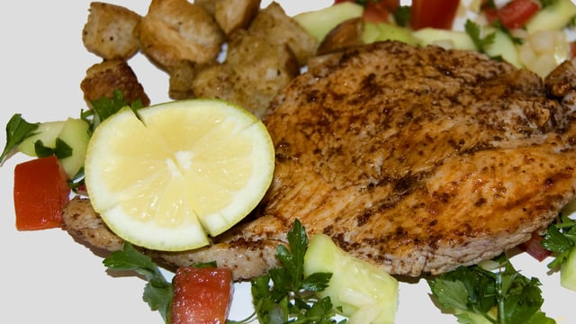 De la dinde, des croûtons, des crudités, des épices orientales.