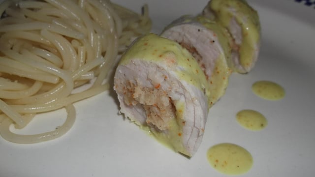 Quand les escalopes sont cuites, les laisser reposer 5 à 10 minutes. Les sortir du cellophane et les couper en rondelles. Ajouter la sauce au curry. Servir chaud !