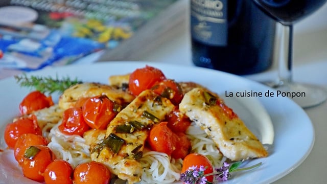 Verser le jus de citron dans la poêle avec les tomates cerises entières et mélanger pour déglacer les sucs. Saler, poivrer, râper le zeste de citron, mélanger et laisser mijoter 5 à 10min jusqu'à ce que les tomates cerises se défassent et que la sauce épaississe. Remettre les morceaux de poulet dans la poêle et laisser cuire 5min, le temps que la viande soit bien réchauffée. Servir aussitôt avec de bonnes pâtes!