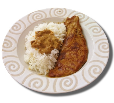 Escalope de veau pôelée avec sauce moutarde, curry, crème fraîche accompagnée de riz, de pâtes ou légumes...