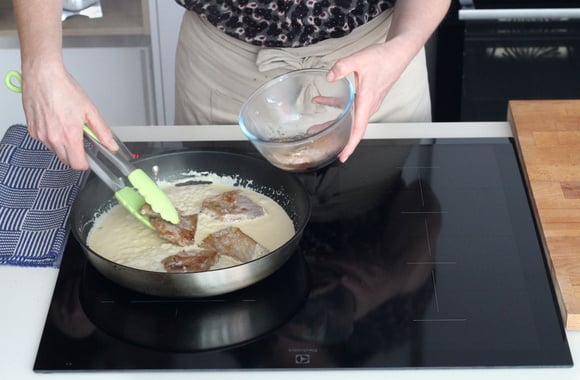 7Quand il n'y a presque plus de liquide, ajoutez la crème et faites réduire jusqu'à ce qu'elle soit bien ontueuse.