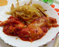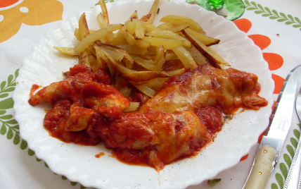 Escalopes de poulet gratinées au Beaufort sur un lit de tomates.