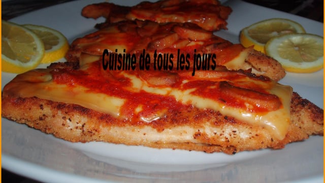 Dans un 1er temps trempez vos escalopes dans la farine,l'oeuf et enfin la chapelure réservez. - 2Préparez votre sauce tomate.Dans une casserole, mettre de l'huile d'olive.Faire revenir les champignons, ajoutez un peu de coulis de tomate,1 c à c de concentré de tomates, du thym ou du laurier (moi j'ai mis du thym,un peu d'eau mais vraiment un peu), du sel et du poivre.Faire réduire la sauce.