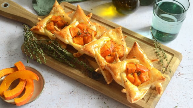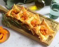 De jolies tartelettes feuilletées au potimarron rôti et au fromage de chèvre frais, avec un façonnage original. Une recette gourmande à servir en guise d'entrée ou comme plat léger accompagné d'une salade verte.