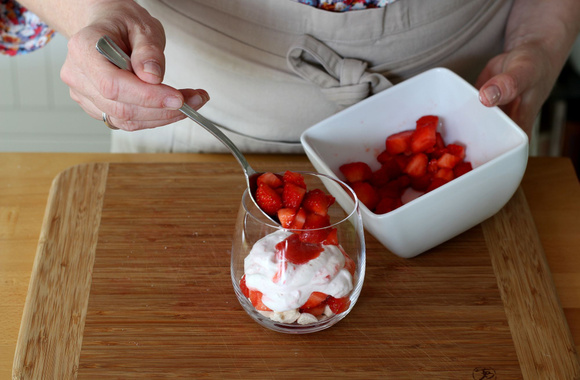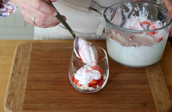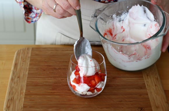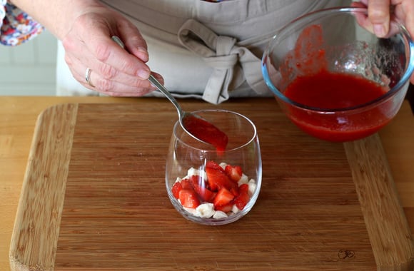 Ajoutez une cuillère à soupe de fraises et 1 cuillère à café de coulis.