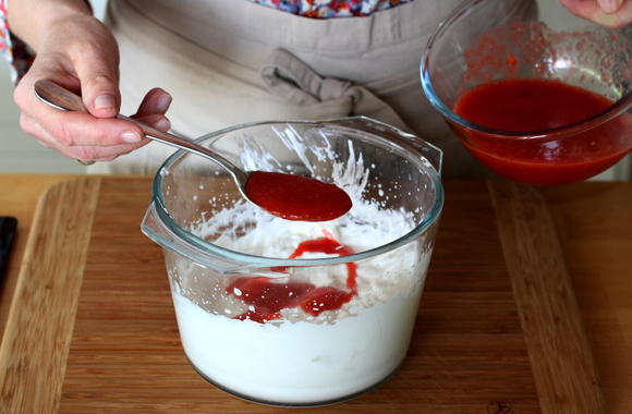8Mélangez la crème et le coulis mais juste un peu afin d'avoir un effet marbré.