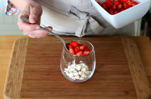 1Lavez vos fraises, séchez-les et équeutez-les. Coupez 15 fraises en dés et réservez le pour le montage de la verrine.