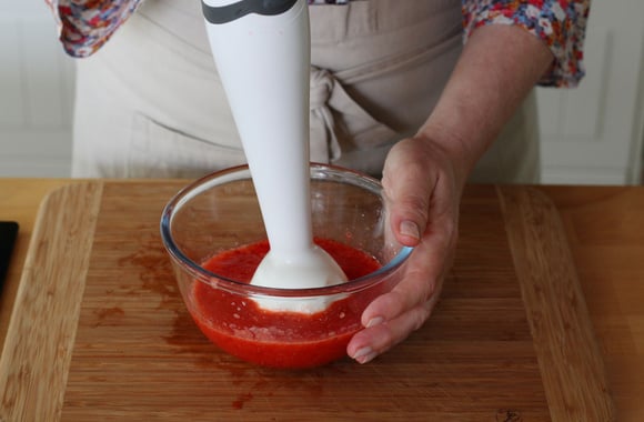 3Versez les fraises coupées en deux dans un bol avec 2 cuillères à soupe de sucre glace puis mixez afin d'obtenir un coulis