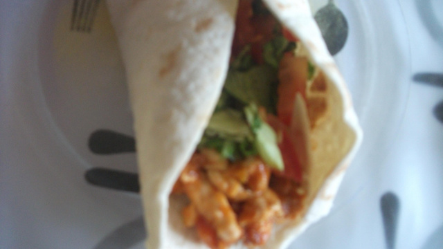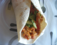 Prendre une tortillas (achetée en grandes surfaces), la faire chauffée 10 à 15 secondes au micro-onde. Ajoutez votre poulet, les poivrons, puis les tomates et la salade. - 7