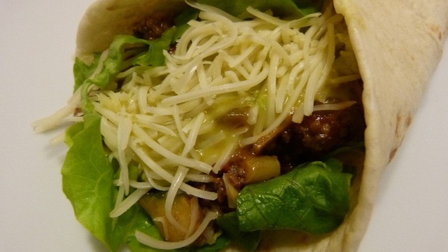 Faire revenir dans la poêle avec un peu d'huile d'olive, l'oignon émincé, la viande hachée,les courgettes et le poivron, coupée en dés, (ne pas éplucher les courgettes), environ 5 min. Verser la sauce pour fajitas et laisser mijoter encore 5 min. Saler/poivrer.