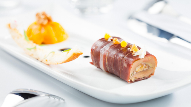 Hâcher 50g d'abricot et de noix et les mélanger. Déveiner 300g de foie gras et l'assaisonner avec sel, poivre et cognac. Le mettre dans un petit emporte-pièce rectangulaire, le filmer et le cuire à 80°C jusqu'à atteindre 58°C à coeur. Laisser refroidir et déposer dessus une couche de hachis abricots-noix. Tailler le magret en carpaccio et enrouler le foie gras dedans. - 2