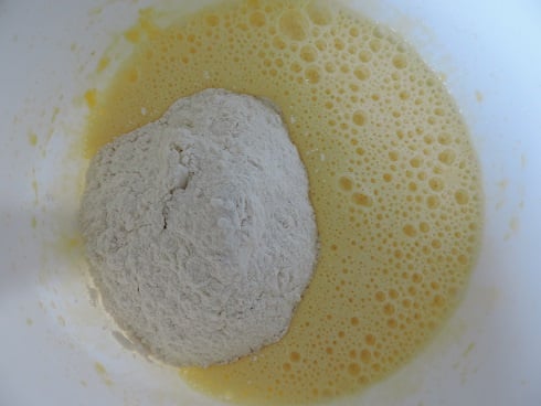 1Dans un saladier, blanchir les oeufs avec le sucre fin. Ajouter la farine et mélanger.