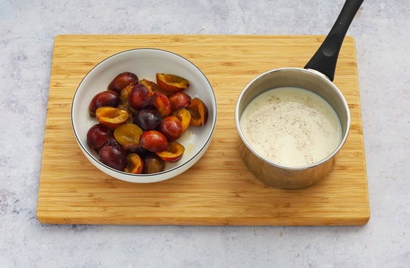1Lavez les prunes, fendez-les pour les dénoyauter. Mettez-les dans un bol, ajoutez le rhum. Faites reposer.