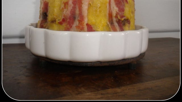 Tapissez le moule avec les tranches de poitrine. Remplir ensuite avec la préparation et bien tasser. Le couvrir et le placer au four dans un bain-marie. Cuire environ 3h30, th 6 (180°).