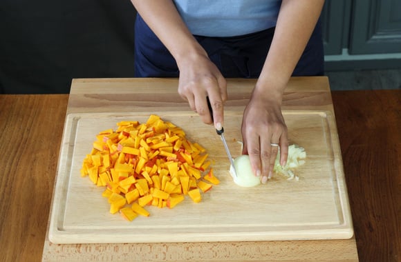 3Emincez finement l'oignon pelé et la gousse d'ail.