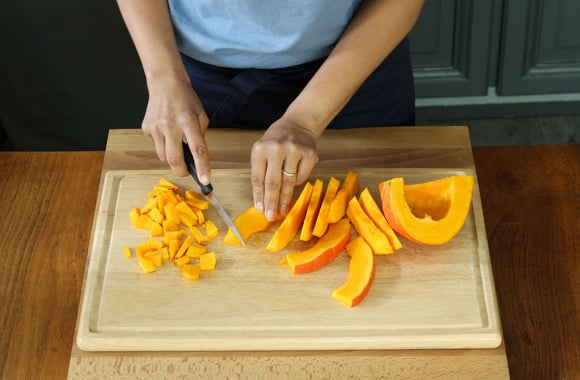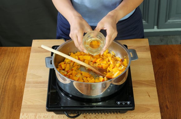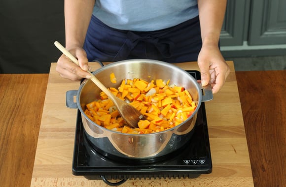 4Dans un faitout, faites chauffer 3 cuillères à soupe d'huile d'olive. Ajoutez les dés de potiron, l'ail et les oignons, faites blondir 5 min en remuant souvent.