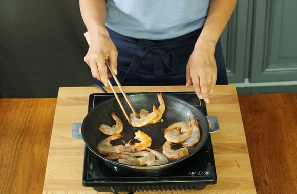 6Faites sauter les queues de gambas dans une poêle avec 1 cuillère à soupe d'huile d'olive.