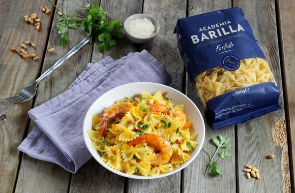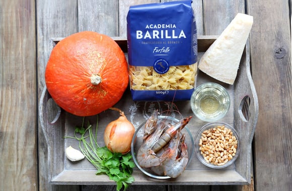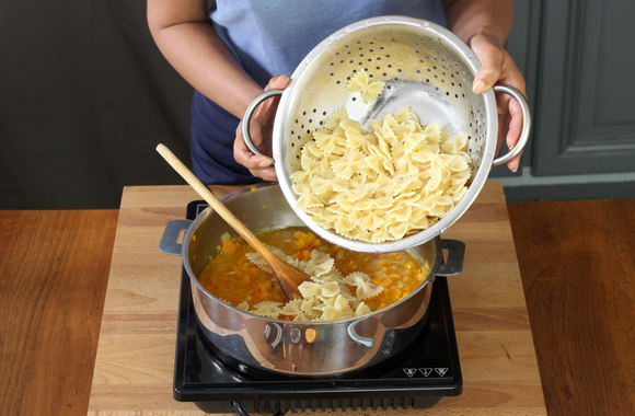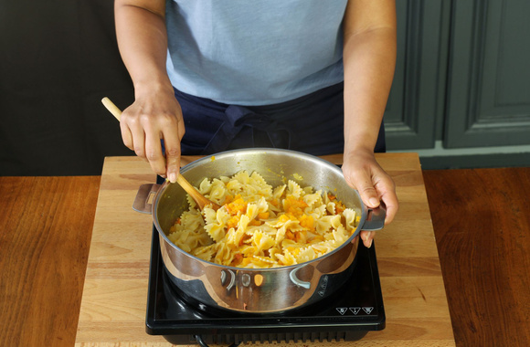 8Une fois les pâtes cuites "al dente", égouttez-les dans une grande passoire, puis versez-les dans le faitout avec le potimarron.