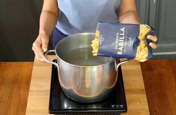 Quand l'eau bout, versez-y les pâtes et remuez avec une cuillère en bois. Faites-les cuire selon le temps de cuisson indiqué sur le paquet.