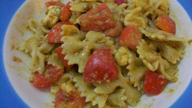 Plat estival de pâtes qui se mange tiède, presque froid.