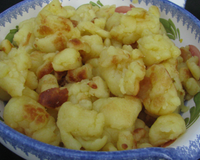 Dans une poêle, faire fondre un peu de beurre. Verser la pâte dans la poêle. Quand la pâte commence à cuire, la décoller et remuer légèrement avec une spatule. Laisser bien cuire la pâte en remuant pour ne pas que ça accroche, si besoin, rajouter du beurre. La pâte doit former des miettes.