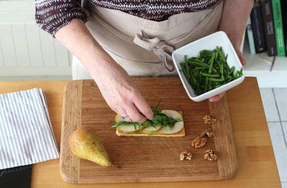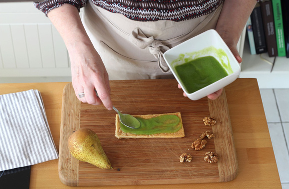 8Coupez le camembert en fines tranches. Détaillez les pousses d'épinard en lanières.