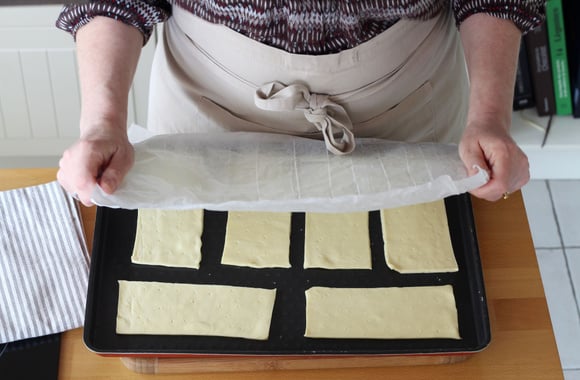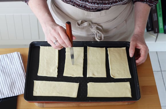 1Dans la pâte feuilletée, détaillez 6 rectangles de 10*5 cm.