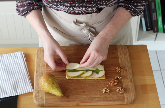 10Disposez 6 tranches de poires.