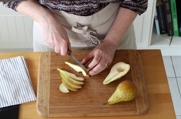 7Coupez les poires en deux, retirez le cœur et la partie centrale puis détaillez de très fines tranches dans chaque demi-poire.