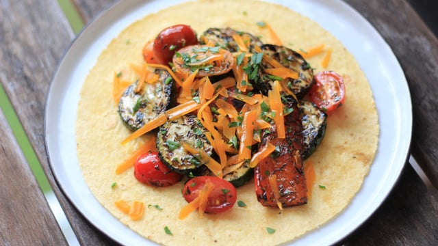 Faites cuire les courgettes et le poivron au barbecue, versez-les dans le bol avec les tomates. Salez et mélangez. Passez rapidement les tortillas sur le barbecue pour les réchauffer. répartissez le mélange aux légumes sur chaque tortilla, ajoutez la mimolette et servez.