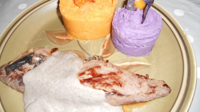 Un duo entre la purée de patate douce et la vitelotte accompagné de ces chips.