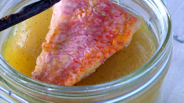 Retirez la verrine du four, déposez un morceau de rouget grillé et servez.