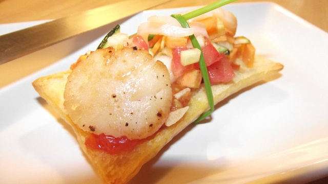 Coupez dans l'épaisseur 3 fines tranches de St Jacques et déposez sur le feuilleté.