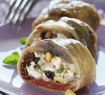 Il n'est pas toujours facile de trouver des feuilles de vigne lorsque l'on veut préparer des dolmadhakia, spécialités grecques. Faute de vigne, on mange... des aubergines : tranches d'aubergines farcies de riz, olives, pignons, feta et raisin.