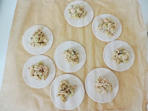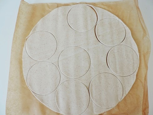 2Déposer 1 c à c bombée de préparation sur chaque rond de pâte feuilletée.