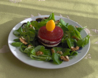 Faire 3 tranches de betterave pas trop épaisses tartinez deux tranches sur 3 avec du boursin aux noix et superposez, déposez sur un lit de salade verte avec un filet d'huile de noix.