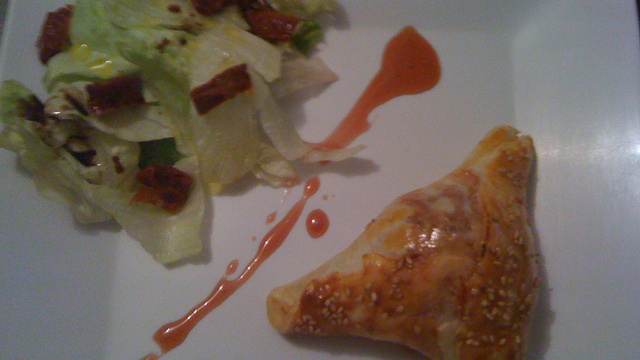 Dressez la salade d'un côté de l'assiette et mettez le feuilleté de l'autre. Nappez le feuilleté avec le sirop et servez tout de suite.